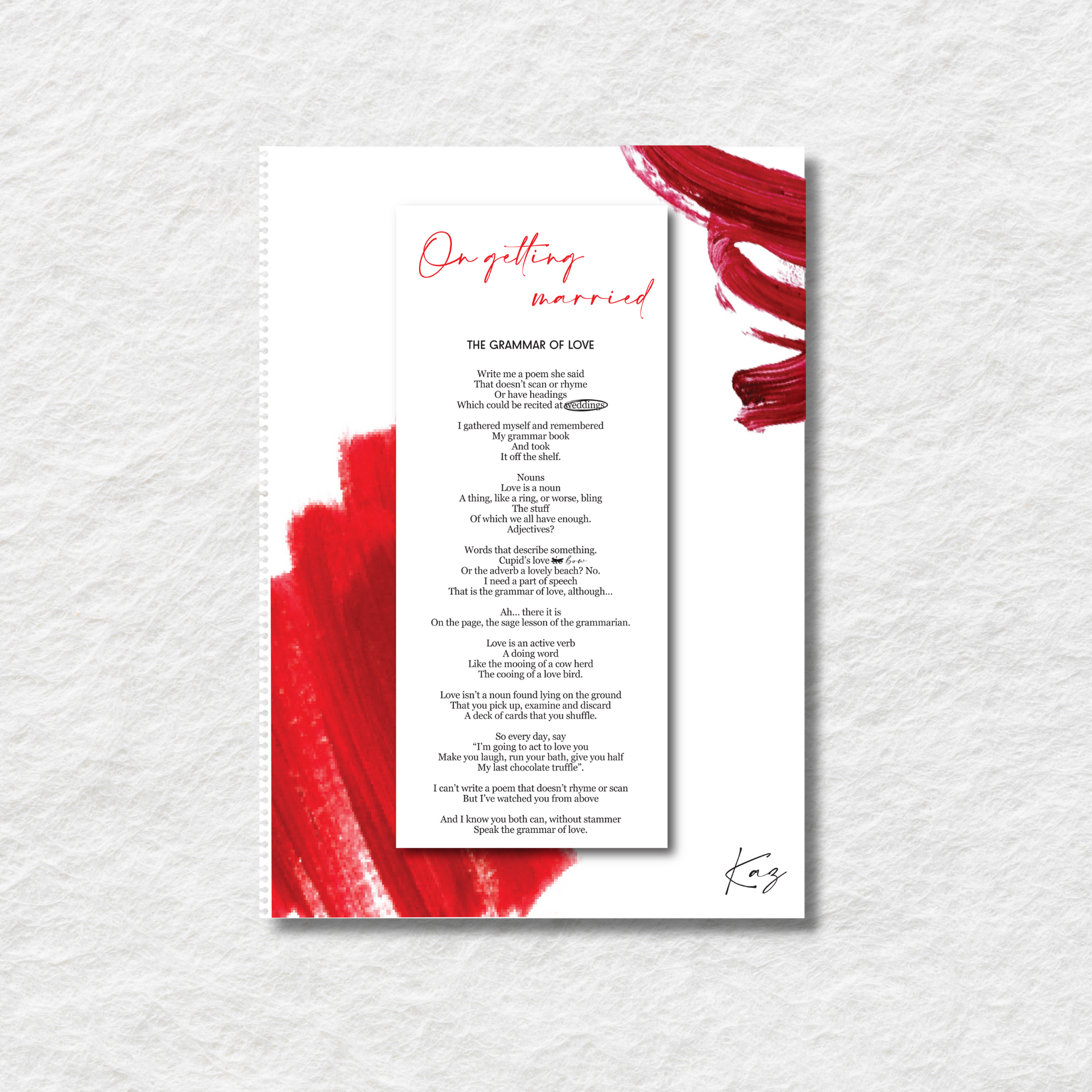 Weddings are such wonderful affairs, I wanted a poem that was a bit mysterious, a bit funny and a bit irreverent. My daughter was planning her wedding and wanted me to write her a poem and recite it in front of all her guests. One of the most useful pieces of advice I have ever been given is that “love is an active verb”. Knowing that my daughter’s education included very little English grammar, as a kind of tease, I wrote this poem about parts of speech: verbs and nouns and adverbs, just to test her. Some brides and grooms of her generation might find it a bit of a challenge, but the sentiment, when you see her and her husband together, is spot on. The message is you have to work at it, but it’s worth it. I hope that resonates with you.